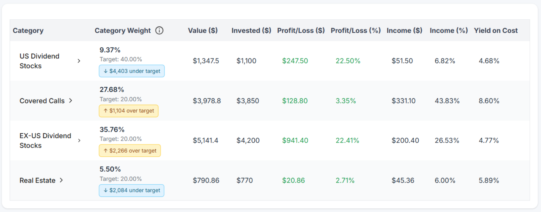 Example: See that you're $10,856 overweight in REITs (not just percentages), or that 68% of your income comes from just 30% of your capital.