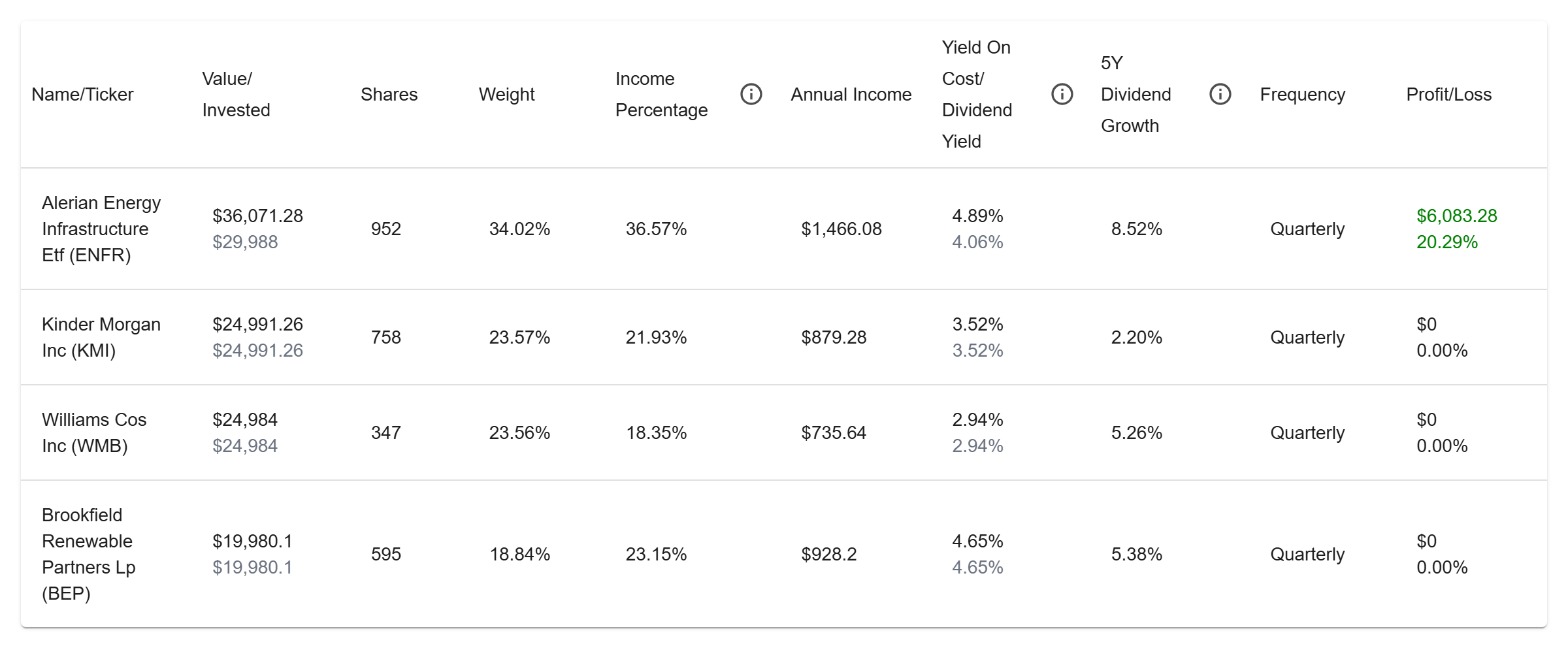 This allocation highlights how midstream infrastructure exposure through ENFR drives the largest portion of income, while BEP, KMI, and WMB contribute additional diversification across renewable power and pipeline transport.