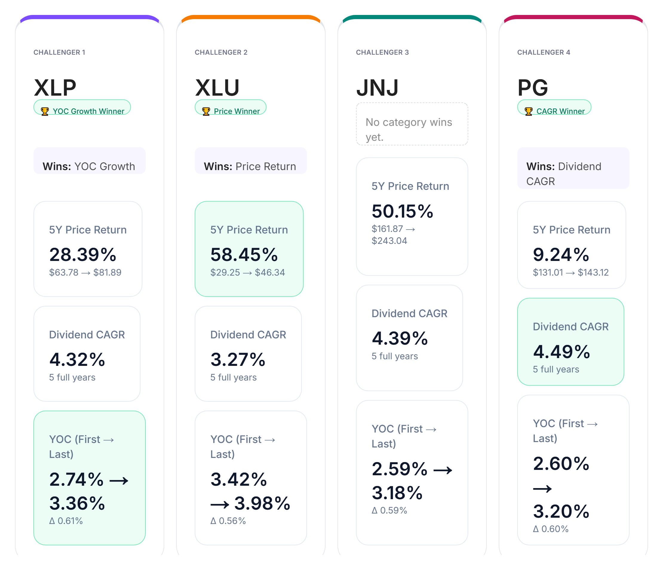 This battle shows that PG leads in dividend growth, while XLU dominates in price appreciation over the five-year period. Meanwhile, XLP demonstrates the strongest yield-on-cost improvement, highlighting how diversified defensive sectors can also deliver efficient income growth.