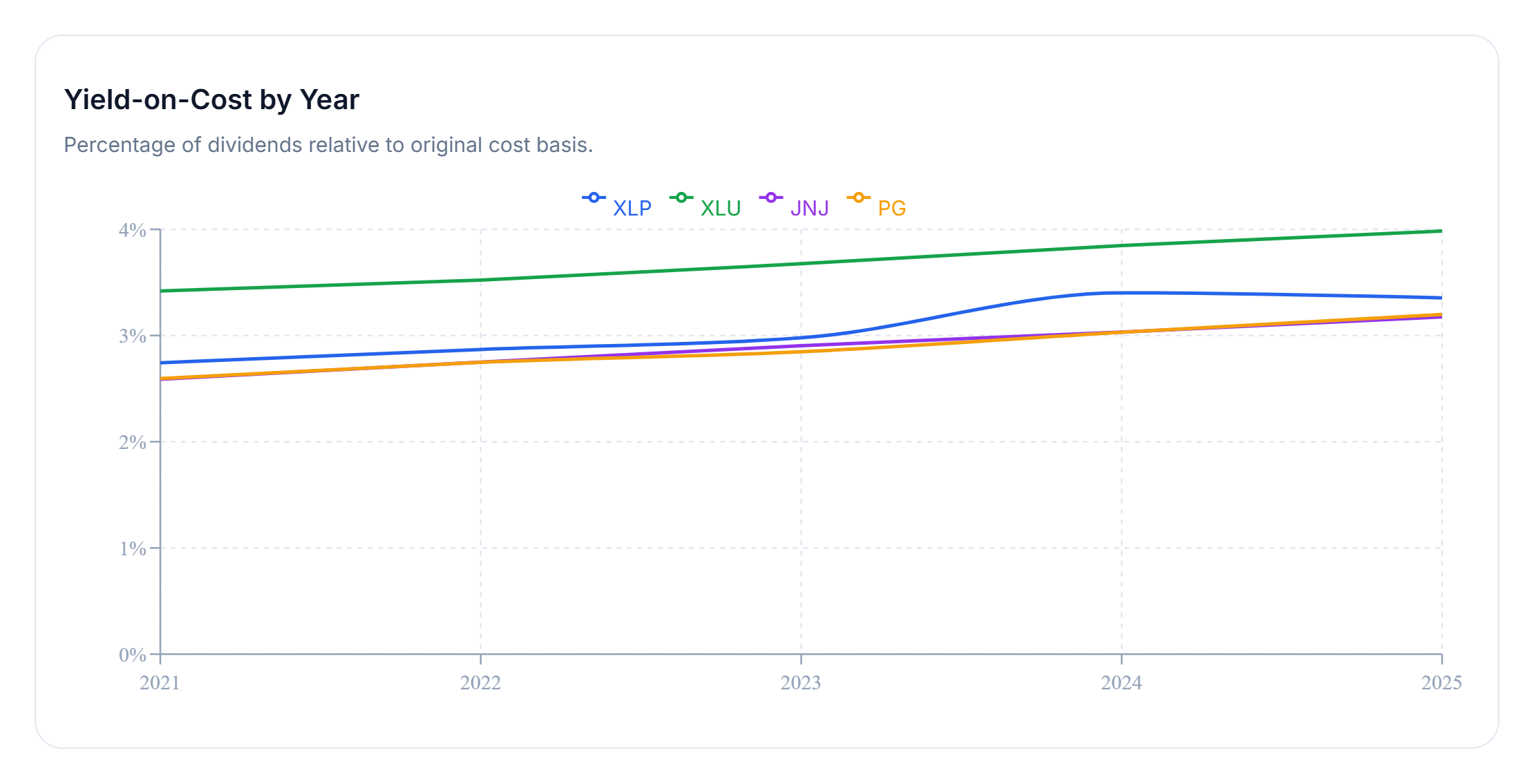 PG, JNJ, and XLP all demonstrate steady upward income trends as well, though their growth trajectories are more gradual. While the differences may seem modest year to year, compounding effects become more visible over longer time horizons.