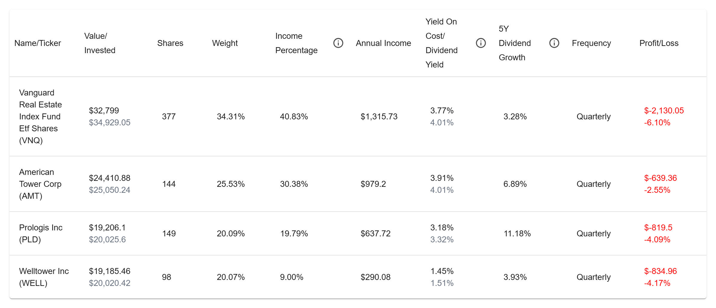 This portfolio is built around high-quality real estate income and long-term property cash-flow growth. It combines Vanguard Real Estate ETF (VNQ), American Tower (AMT), Prologis (PLD), and Welltower (WELL) to capture income from multiple real estate sectors.