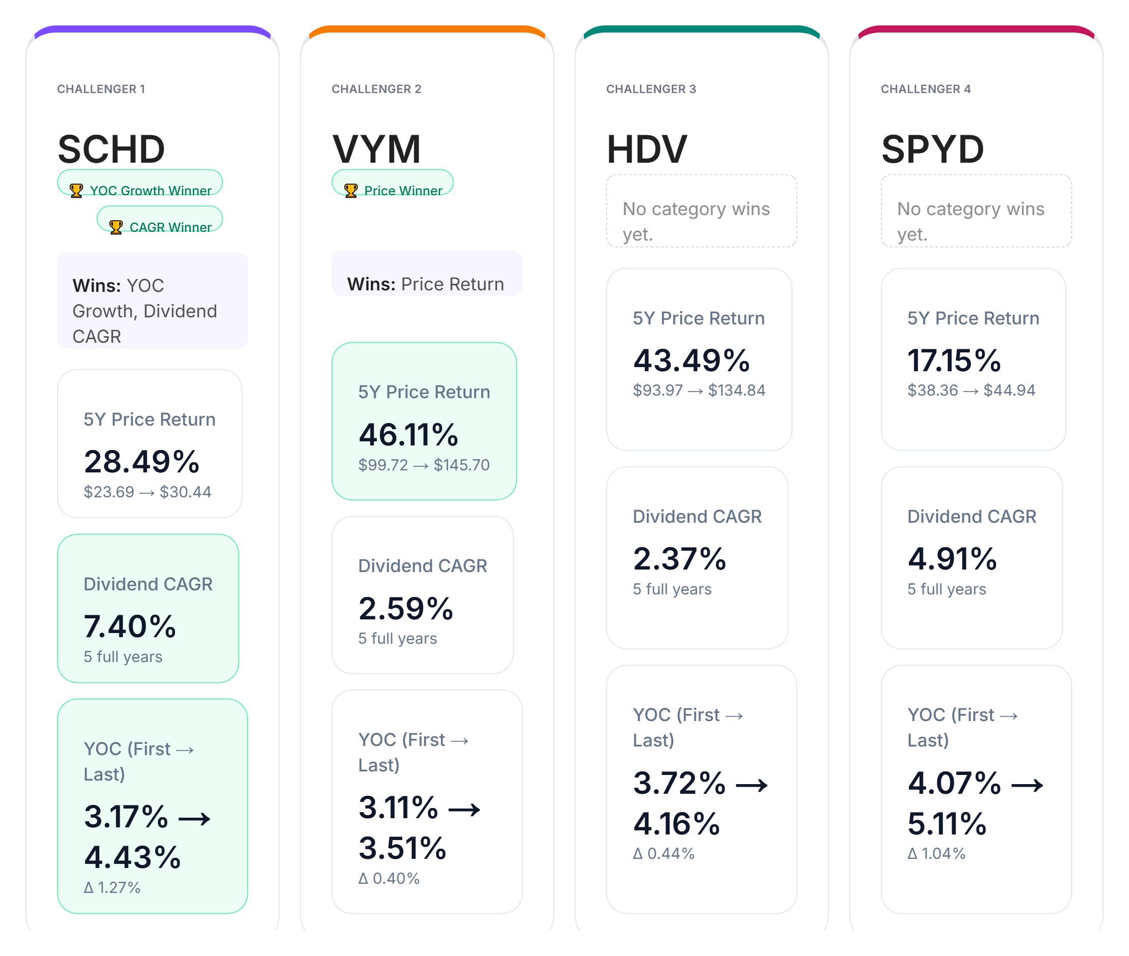 HDV and SPYD both deliver solid results across the metrics, but do not secure a category win in this particular comparison. The results illustrate how different ETF strategies balance yield, growth, and total return.