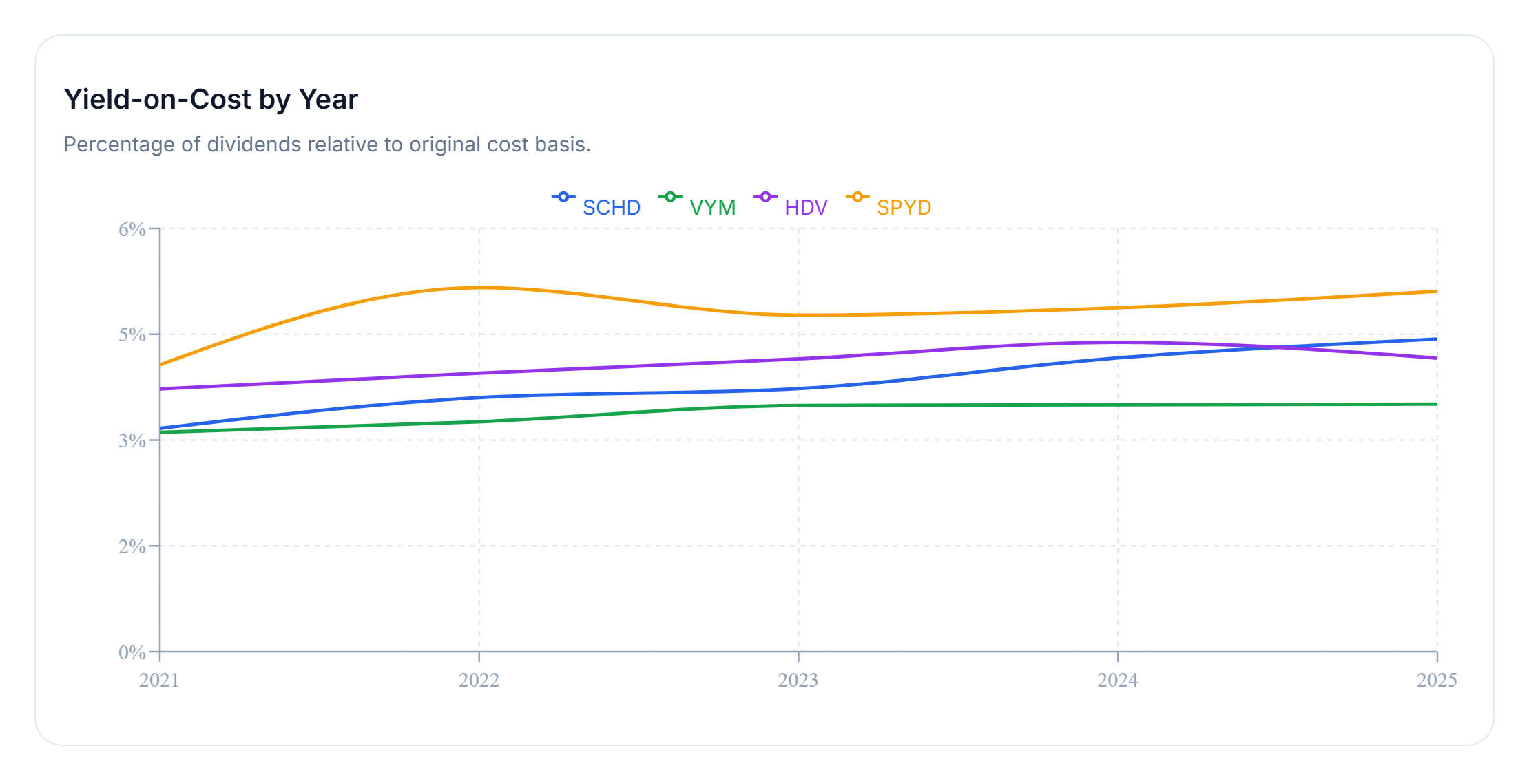 Over the five-year window, SPYD stands out with the strongest income efficiency, reaching approximately 5.11% yield on cost by the end of the period.